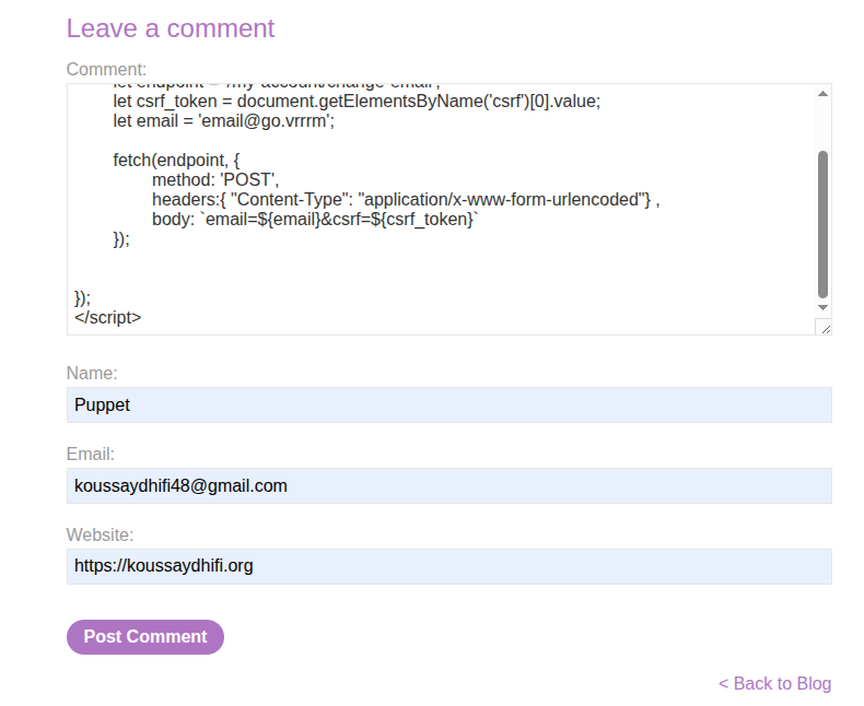 We are going to leverage the CSRF token that we are going to hijack using XSS to change the email of the victim. From this description we can say that we will be fetching an endpoint named /my-account/change-email that takes the CSRF token and the new email address as parameters.